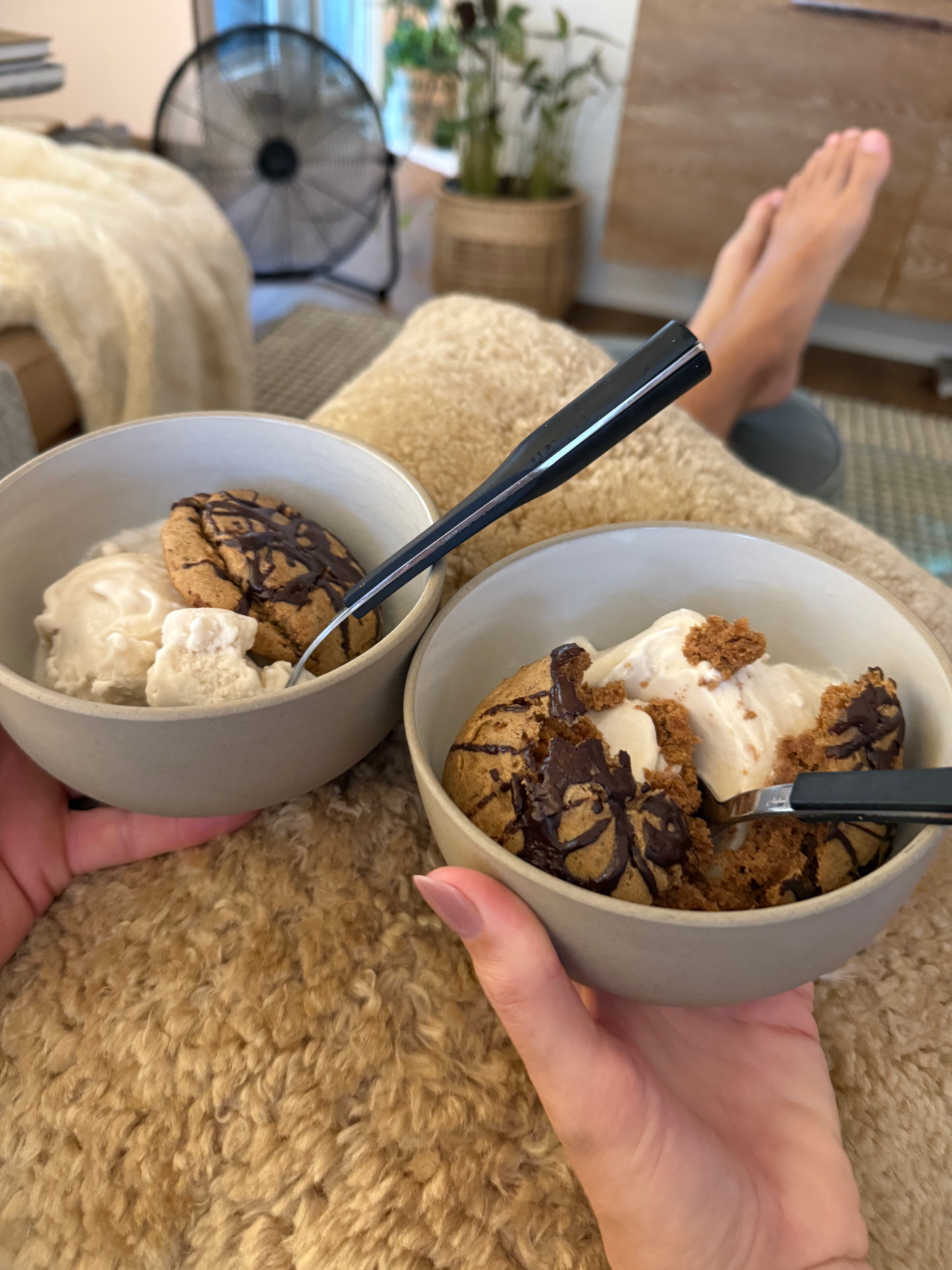 Homemade ice cream using coconut cream as the base and monk fruit as the sweetener (Ninja Creami to the rescue). A warmed gluten-free cookie addition below from one of my in-person health clients.