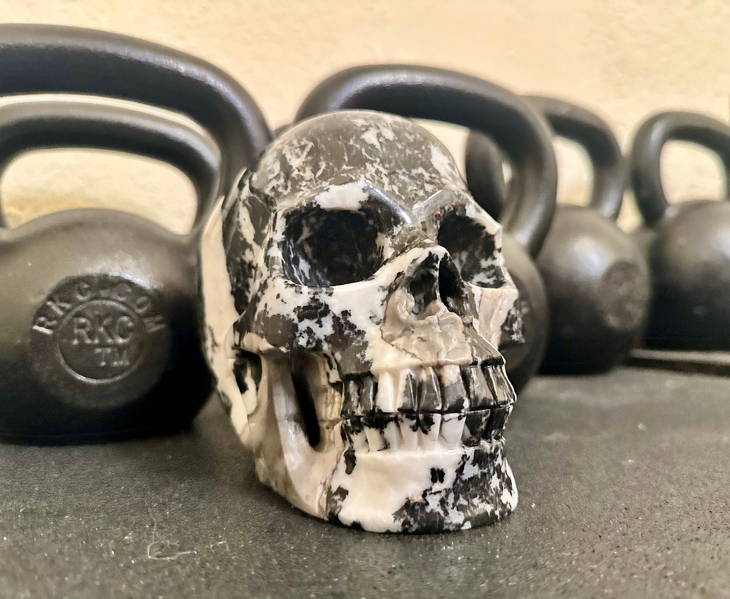 I’ve wanted a large skull for a while… Not to be morbid, but Memento Mori. This Zebra Stone from Western Australia has my favorite color combination of black and white and fits perfectly in our home gym.