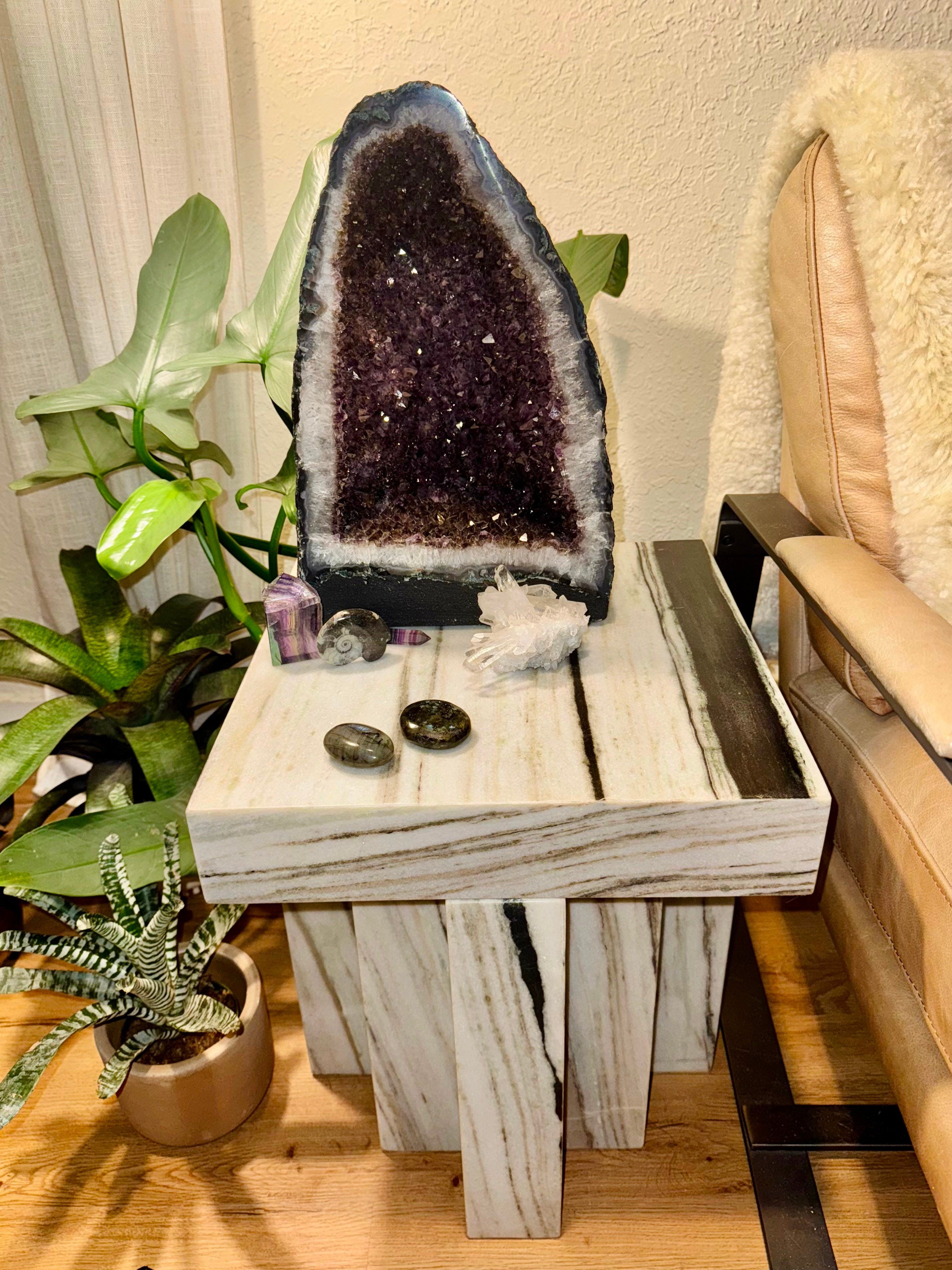 Ametrine (amethyst and citrine) Cathedral on a marble side table.
