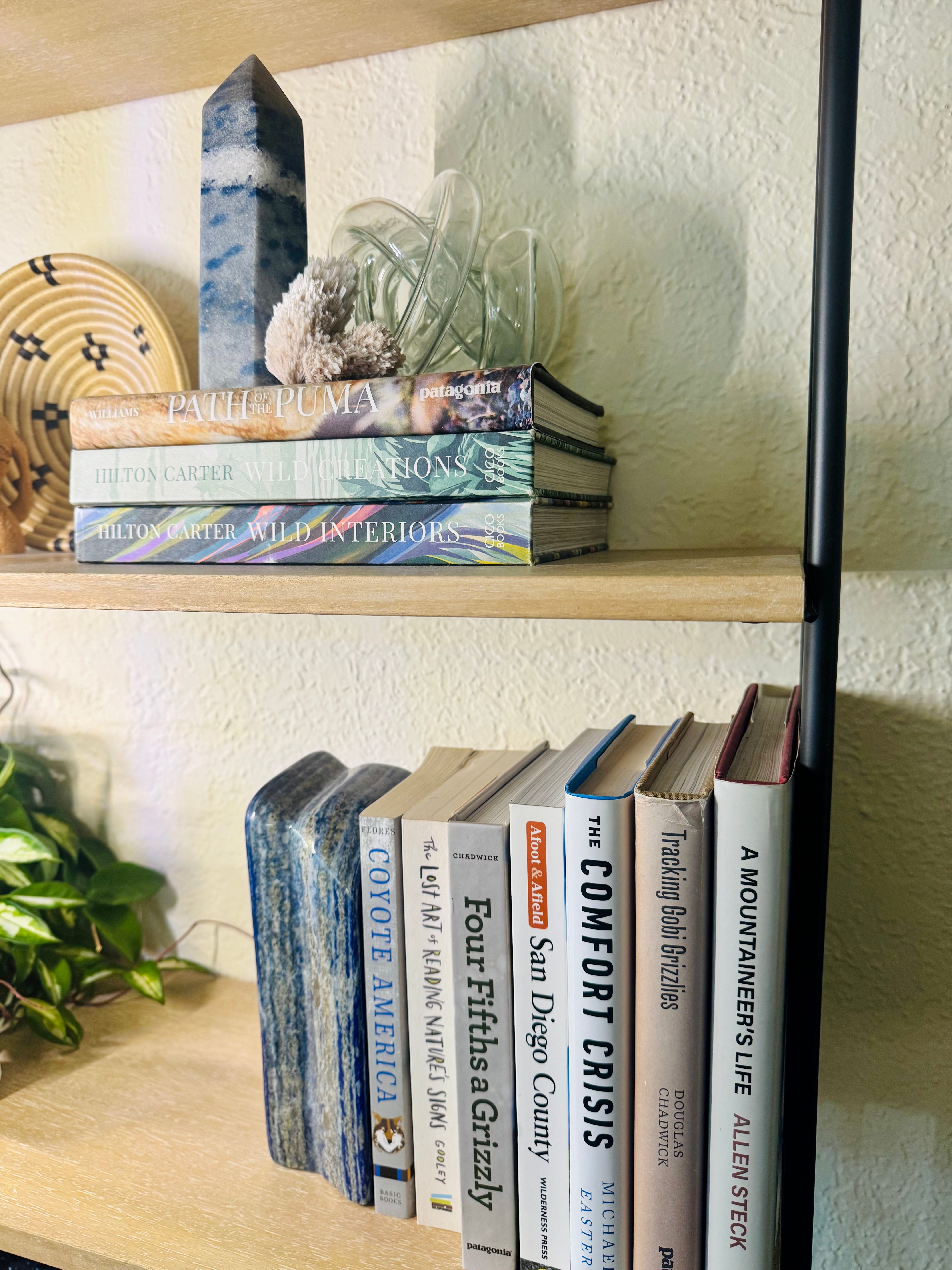 It holds crystals and plants. My favorite books (many of them beautiful hardbacks from Patagonia Publishing), a three-point deer, and other small artifacts collected over time and distance.